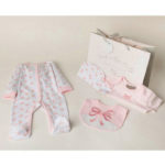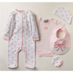 This six piece gift set is the perfect gift for a newborn baby girl . Presented in a Handy Gift Bag, this set includes a long sleeve sleepsuit, short sleeve bodysuit, , bib, hat and gloves. All items are made with supersoft pure 100% cotton that is comfortable to wear and stays soft after repeated washing and tumble drying. Nickel-free poppers ensure no irritation to delicate skin and no harmful dyes or chemicals have been used, keeping your baby safe.  100% Cotton.