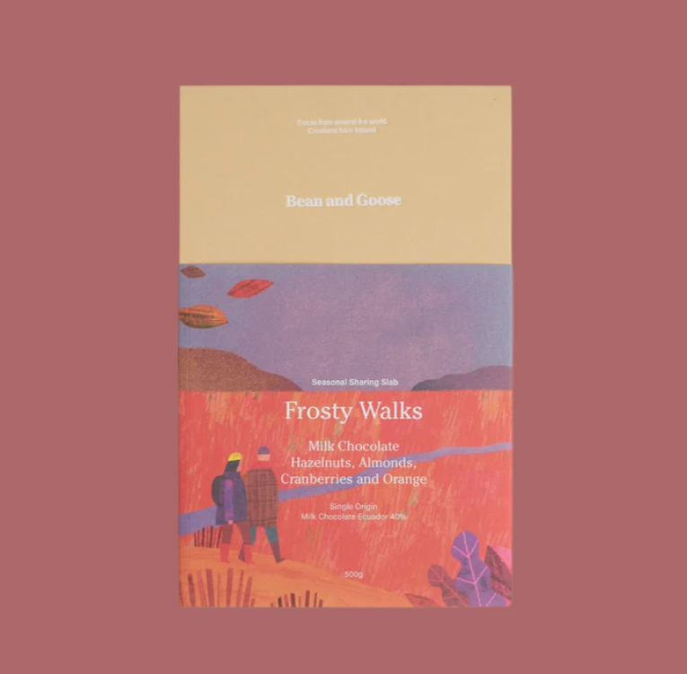 The Bean & Goose 500 g sharing slab is of single-origin Ecuadorian milk chocolate (40%) is topped with winter fruit, caramelised nuts, honey, and sea salt — a bar made for crisp evenings, wool scarves, and laughter shared around the fire.