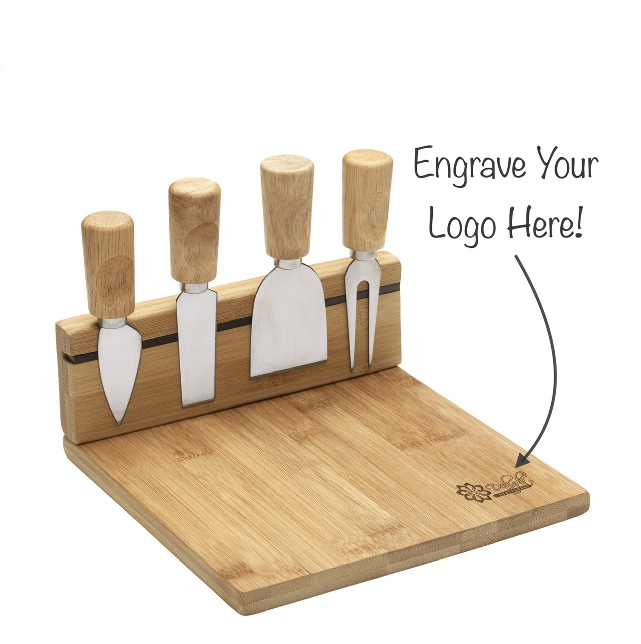 Bamboo cheese board with knife holder equipped with a magnetic strip. Incl. 3 cheese knives and 1 cheese stick.