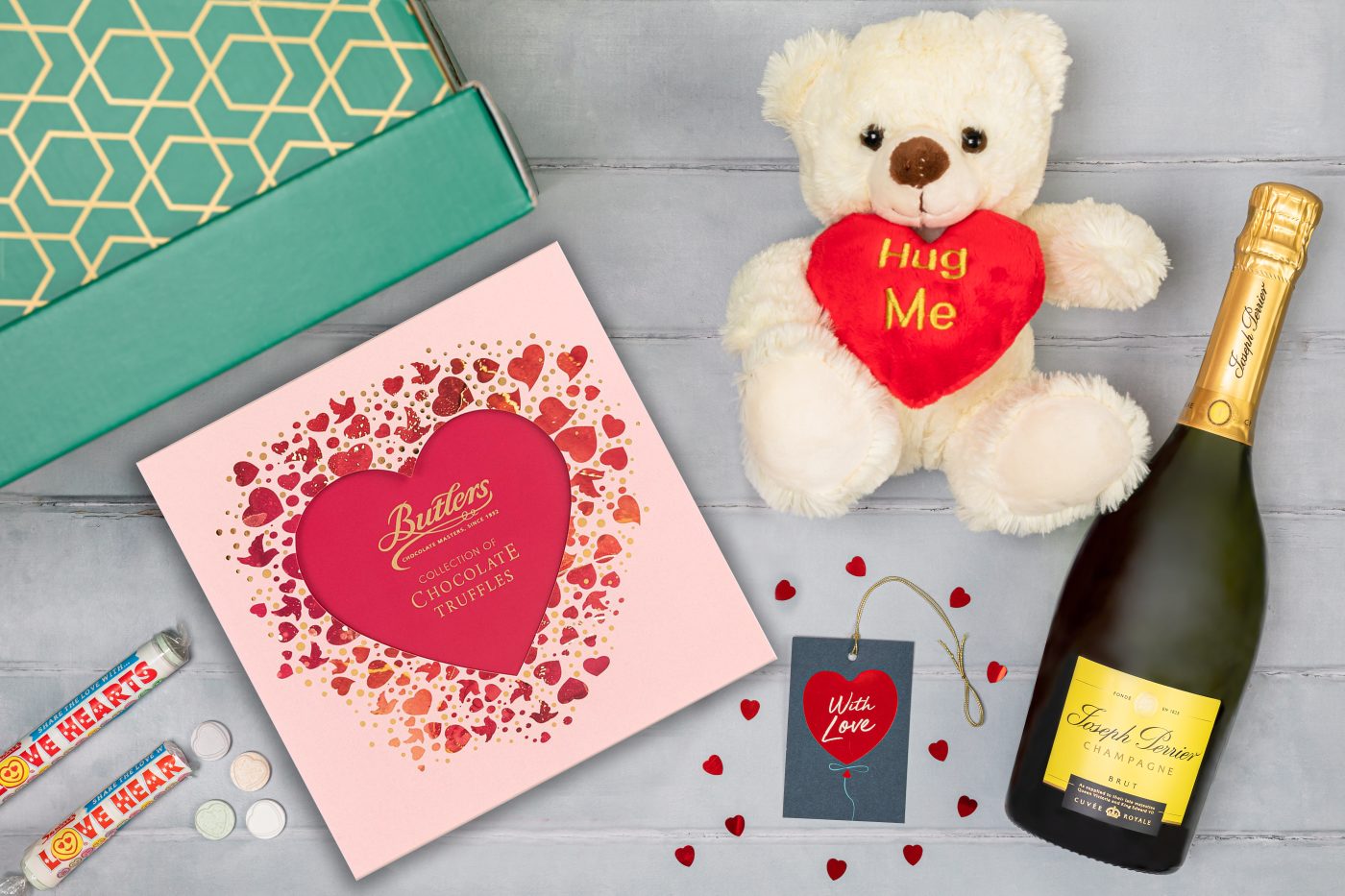 Give a romantic surprise by sending a Cuddly Bear Valentines Hamper. Filled with Valentines essentials – chocolates , bubbles , sweets  and an adorable cuddly teddy bear!